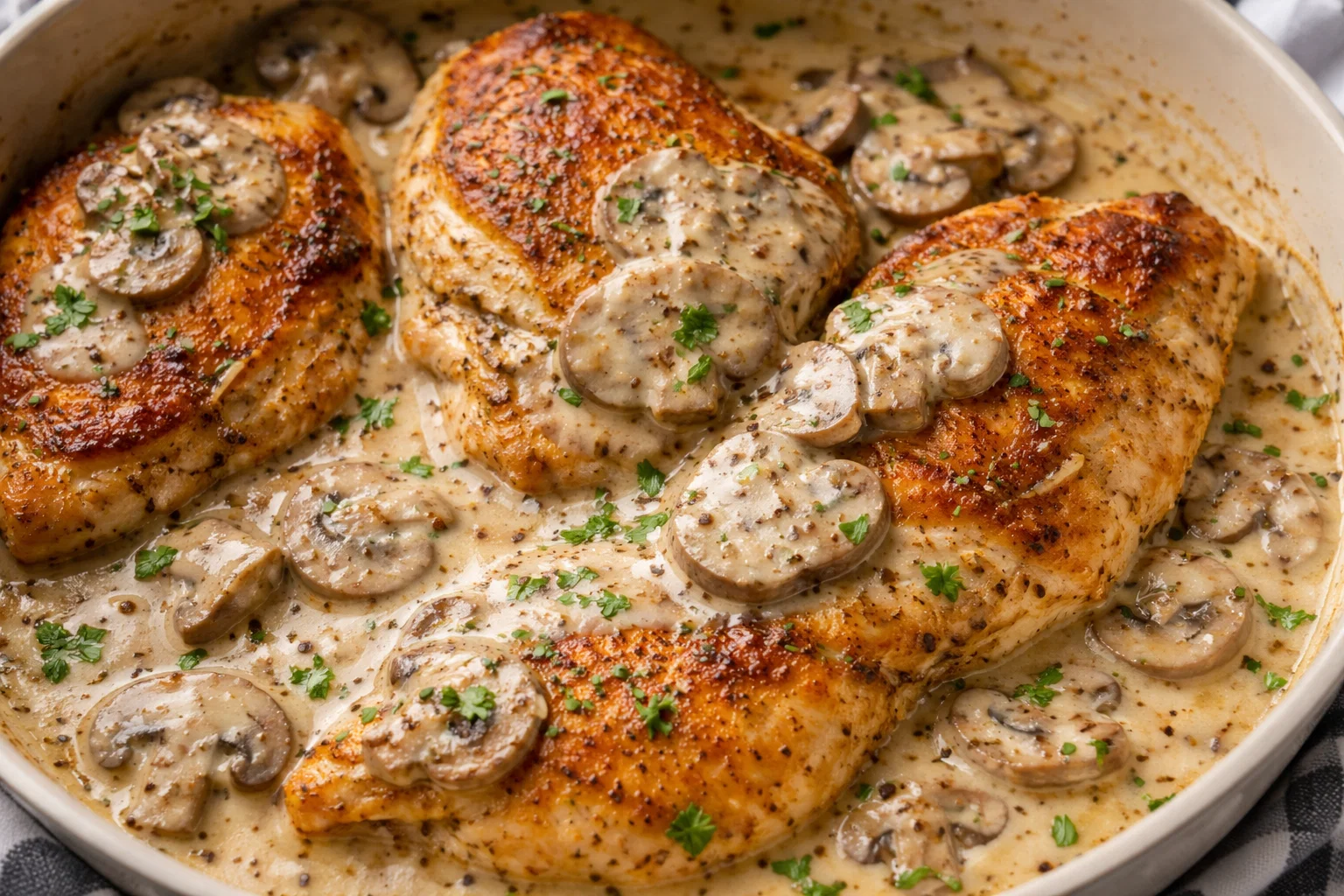 Return the chicken to the skillet, coating it with the creamy mushroom sauce. Let everything simmer together for 2-3 minutes for flavors to meld.