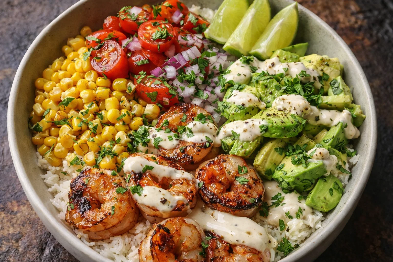 Grilled Shrimp Bowl with Avocado, Corn Salsa & Creamy Sauce: A Tropical Delight