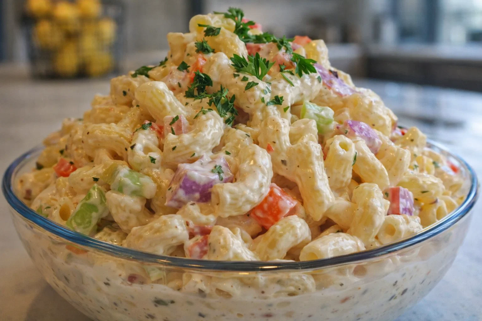 What sets this pasta salad apart is its captivating blend of flavors and textures. It combines al dente macaroni with crunchy veggies and a rich dressing that’s not only appealing to the taste buds but also nutritious. Whether you’re a time-strapped parent, a health-conscious individual, or just someone looking to enjoy a tasty meal, this recipe is sure to impress.